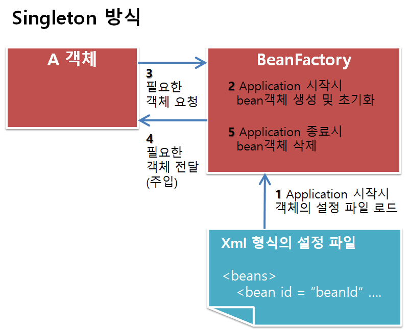 Singleton방식은 BeanFactory가 xml형식의 파일을 읽어들여 Application 시작시 bean객체를 생성 및 초기화해둔다. 어떤 객체가 BeanFactory에게 특정 객체를 요구하면 생성해두었던 객체를 전달해준다. 그리고 다른 객체가 동일한 객체 사용을 요구하면 갖고있던 객체를 생성해두었던 객체를 전달해준다. 즉, 하나의 객체를 생성하여두고 필요한 다른 객체들이 공유하여 사용하는 형태이다. 따라서 어플리케이션이 종료될 때 비로소 객체가 소멸될 수 있다.
