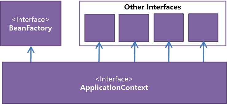 | ApplicationContext가 추가적으로 상속받고 있는 것이 궁금하다면? [ AppicationContext와 BeanFactory의 비교 ] http://wonwoo.ml/index.php/post/1571 [ AppicationContext가 추가적으로 상속받고 있는 인터페이스들의 목록 ] EnvironmentCapable, MessageSource, ApplicationEventPublisher, ResourcePatternResolver |