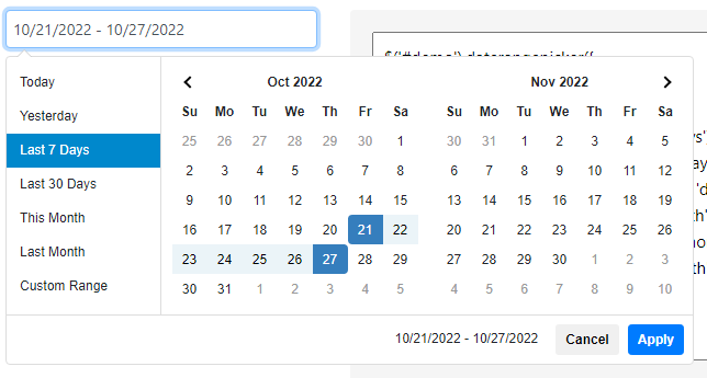 $('#demo').daterangepicker({ "minYear": 1000, "maxYear": 9999, "locale": { "format": 'YYYY-MM-DD', "separator": " ~ ", "applyLabel": "확인", "cancelLabel": "취소", "fromLabel": "From", "toLabel": "To", "customRangeLabel": "Custom", "weekLabel": "주", "daysOfWeek": [ "일", "월", "화", "수", "목", "금", "토" ], "monthNames": [ "1월", "2월", "3월", "4월", "5월", "6월", "7월", "8월", "9월", "10월", "11월", "12월" ], "firstDay": 1 }, }, function(start, end, label) { console.log('New date range selected: ' + start.format('YYYY-MM-DD') + ' to ' + end.format('YYYY-MM-DD') + ' (predefined range: ' + label + ')'); }); |