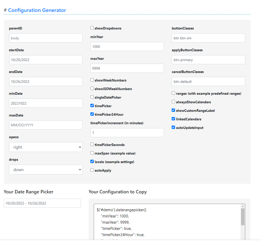 | $('#demo').daterangepicker({ "minYear": 1000, "maxYear": 9999, "locale": { "format": "MM/DD/YYYY", "separator": " - ", "applyLabel": "Apply", "cancelLabel": "Cancel", "fromLabel": "From", "toLabel": "To", "customRangeLabel": "Custom", "weekLabel": "W", "daysOfWeek": [ "Su", "Mo", "Tu", "We", "Th", "Fr", "Sa" ], "monthNames": [ "January", "February", "March", "April", "May", "June", "July", "August", "September", "October", "November", "December" ], "firstDay": 1 }, }, function(start, end, label) { console.log('New date range selected: ' + start.format('YYYY-MM-DD') + ' to ' + end.format('YYYY-MM-DD') + ' (predefined range: ' + label + ')'); }); |