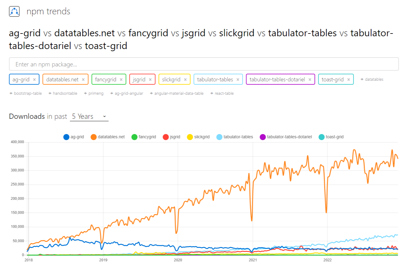 npm 트랜드를 사용하여, 라이브러리의 다운로드 횟수를 비교해보았습니다. 많은 그리드 라이브러리 중 datables.net의 다운로드 횟수가 가장 많은 것으로 확인됩니다. 그리고, 최근 증가세가 가파른 toast-grid를 비교해보겠습니다.
