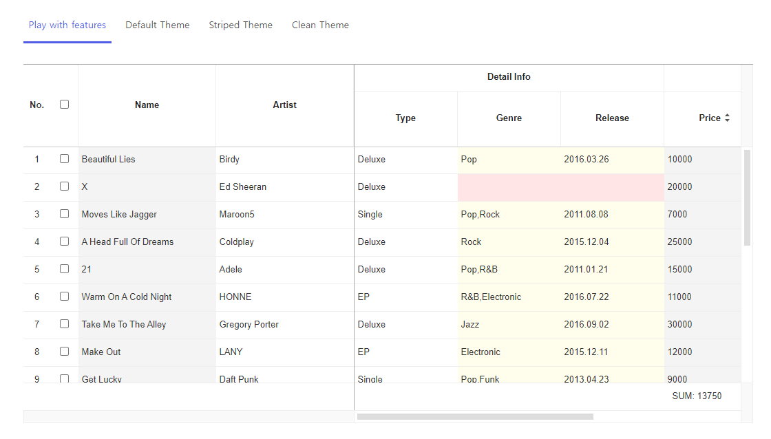 기능들을 간단히 설명하자면, 행이나 열을 합칠 수 있으며, 대용량 데이터 처리에도 무리가 없습니다. 또한 그리드 내에서 데이터 수정이 가능하며, 날짜 선택시 보여지는 캘린더도 다양한 형태로 제공하고 있습니다.