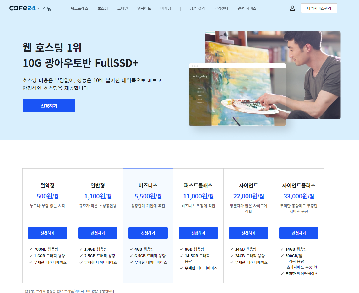 다음으로 알아본 곳은 Cafe24입니다.. 처음에 혹했던것은 광아우토반이었습니다. 업무용으로 사용해야 했기에, 넉넉한 트래픽 용량과 무료 서비스가 무척이나 마음에 들어서 결제까지 하려 했으나, PHP만 지원한다는 점! j워드프레스나 그누보드를 사용하는 경우에는 사용가능하나, SpringBoot로 개발했기 때문에, java는 필수적이었습니다. 하지만 별도로 java를 설치하는 것도 불가능하기 때문에 포기했던 상품입니다. 하지만, 자바를 위한 상품은 따로 있었습니다.