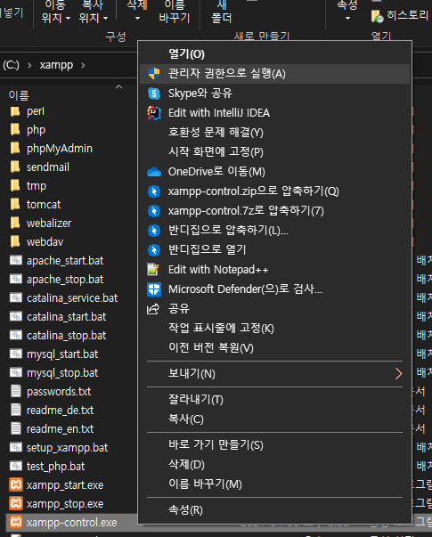 xampp/xampp-colorl.exe 파일을 관리자 권한으로 실행합니다.