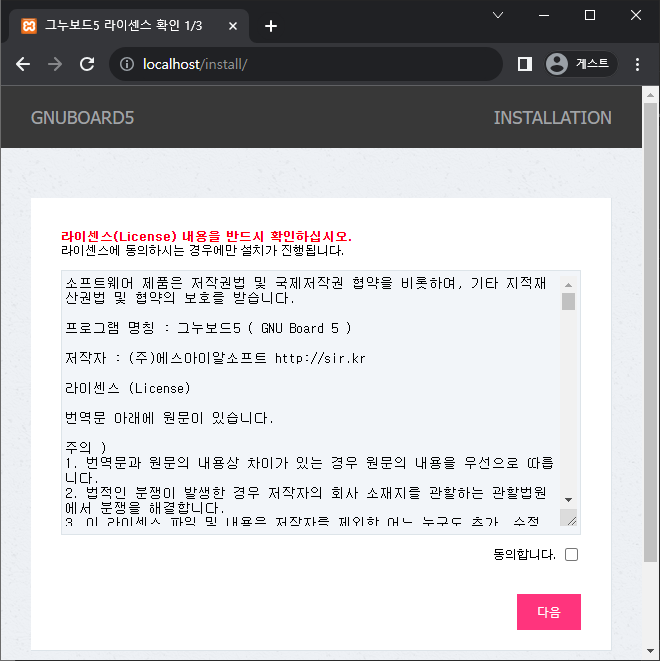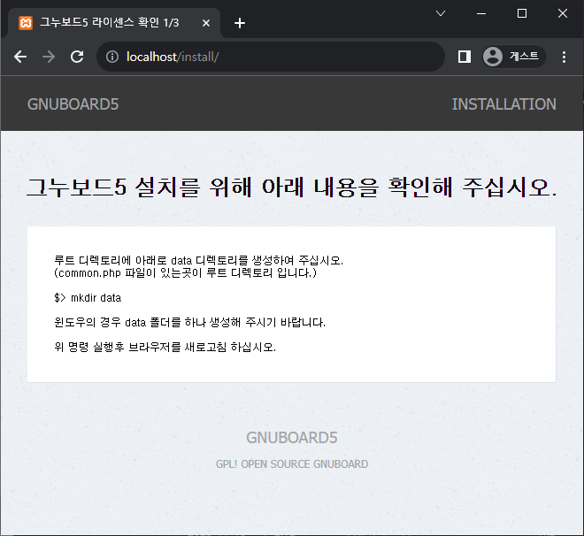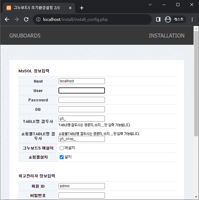 이렇게 그누보드 설치 페이지가 나옵니다!