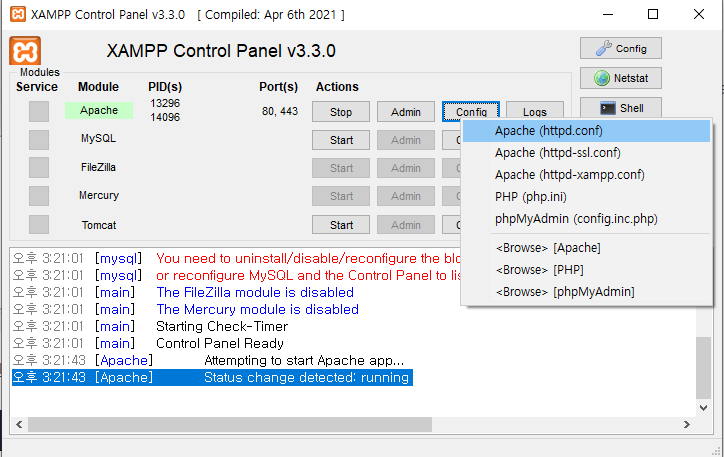 Apahce Start버튼을 눌러 Apache를 실행합니다.