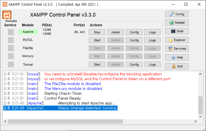 오른쪽처럼 Apache가 초록색 배경으로 변하고, 상태가 running으로 바뀌면 정상적으로 실행된 것입니다.