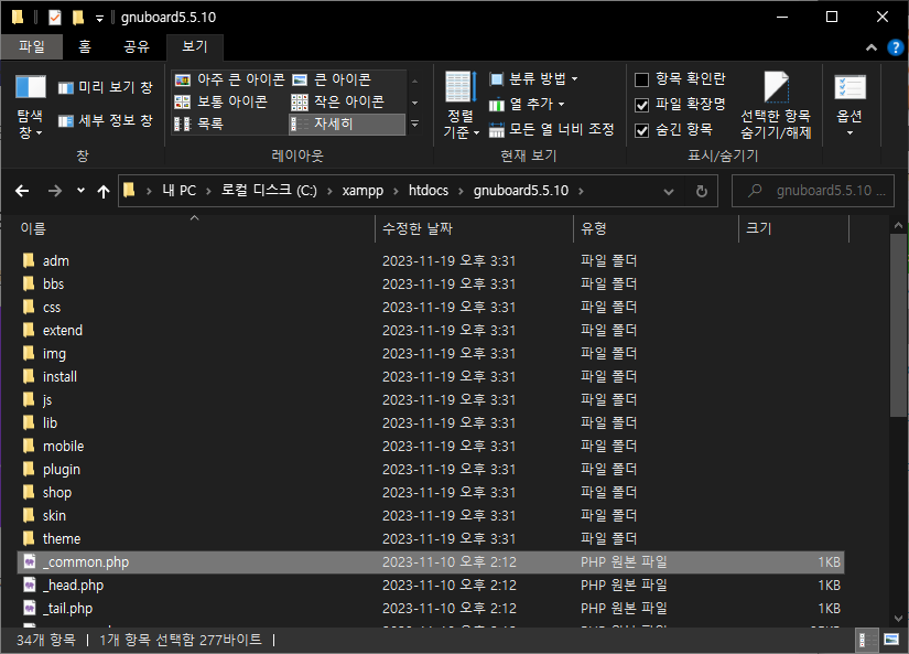 결국 사이트 배포, 로컬 설정까지 이틀의 시간이 걸렸습니다. 여기에 담지는 못했지만, XAMPP를 사용하지 않고 Apache24와 그누보드를 연결하는 것은 매우 힘든 일이었습니다... php의 프레임워크를 제대로 이용하고 싶어서 laonBoard를 설치했다가, 검색해도 해결할 수 없는 에러들을 만나고 그누보드로 옮겨왔습니다. 이제 php와 Apache24를 연결하는데 이런저런 문제들이 발생하는데 Apache에서 php모듈을 불러오는데 알 수 없는 에러가 발생하더라구요... 이것저것 알아보다가 XAMPP를 사용하는 것이 좋다는 댓글을 보게 되었고, XAMPP로 실행했더니 아주 깔끔하게 설정이 완료되었습니다.