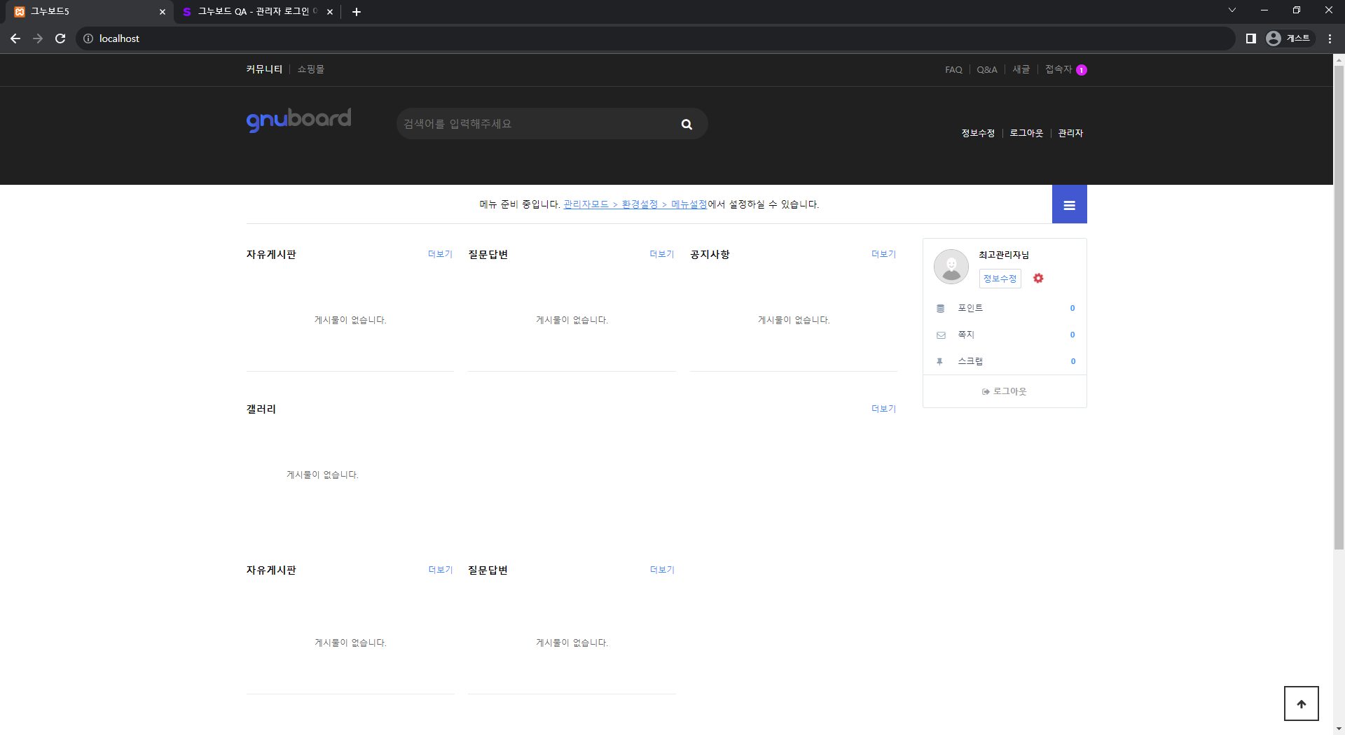 새로운 그누보드로 이동버튼을 누르고, 아까 입력했던 최고관리자 정보를 입력하여 로그인을 해봅니다.