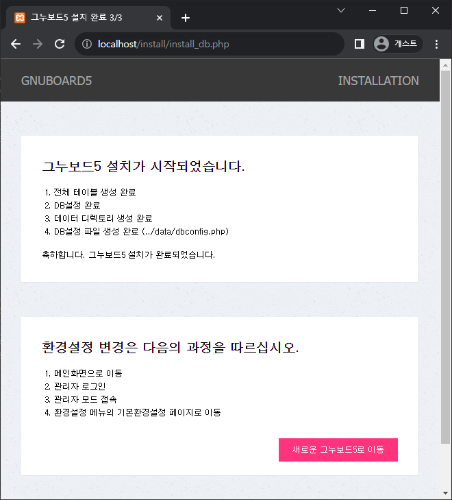 이것으로 그누보드 띄우기 성공입니다!