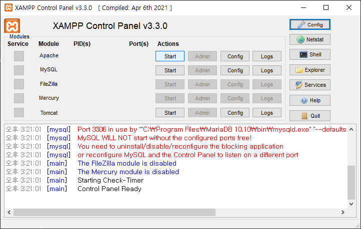 오류가 발생하면 c:/xampp경로가 맞는지 확인해주세요. 설정파일에 기본경로가 C:/xampp로되어 있어서, 다른 경로에서는 정상적으로 실행되지 않을 수 있습니다.