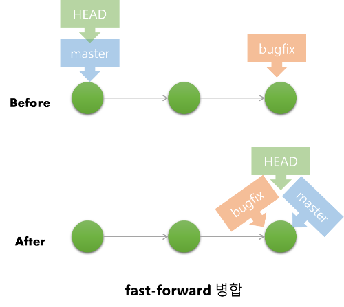 현재 브랜치와 bugfix 브랜치를 병합하는 명령어입니다. 아래의 병합전 준비와 fast-forward 부분을 보면서 스크립트를 직접 따라해보세요.