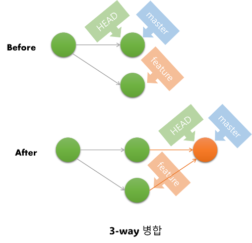 3-way 상태는 두 브랜치가 공통 커밋에서 갈라져 나온 상태를 나타냅니다. 이 상황에서 병합을 수행하는 것을 3-way 병합이라고 합니다. Fast-forward 병합과는 달리 새로운 커밋 히스토리가 생성됩니다.