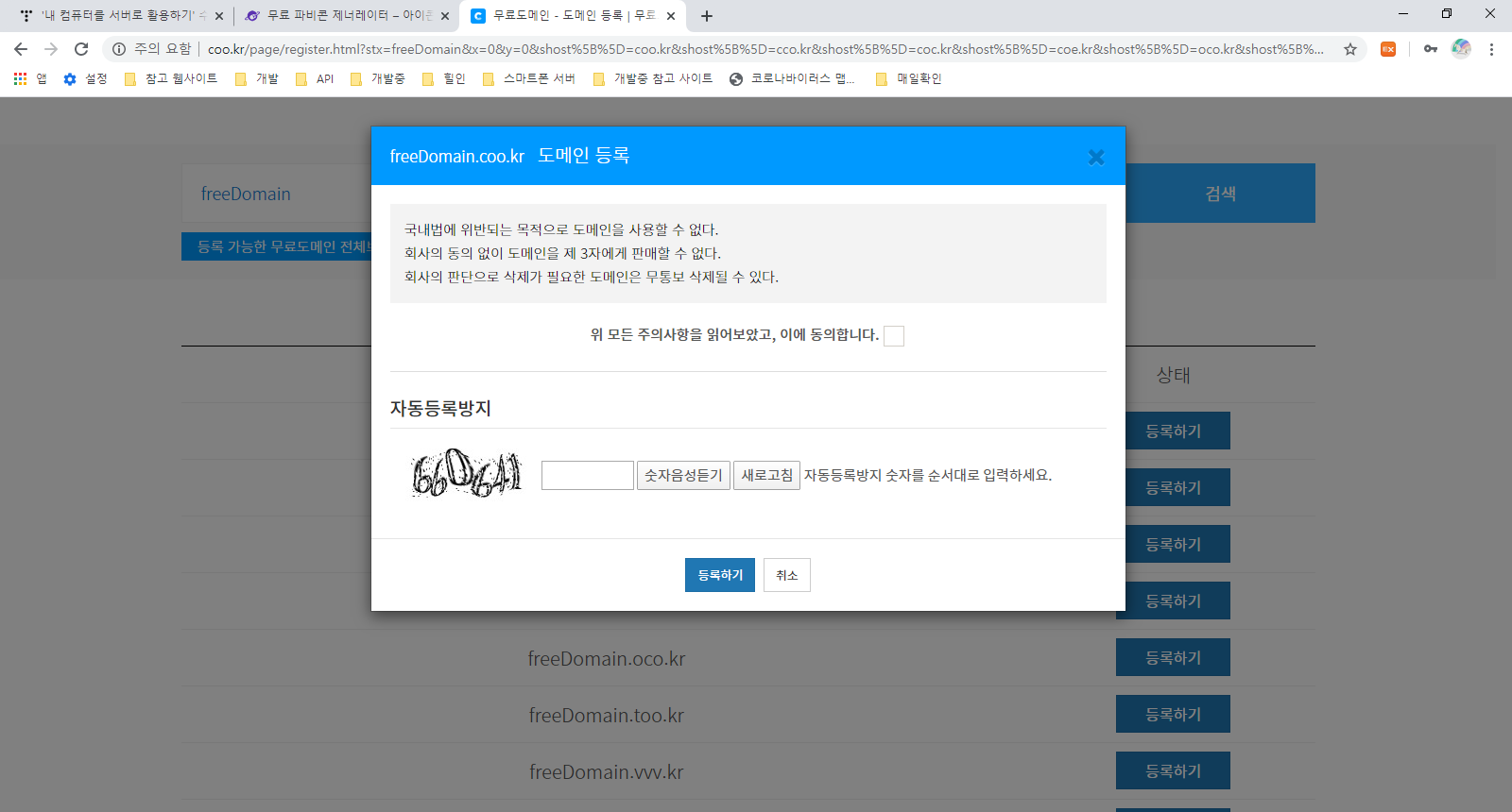 주의사항을 읽고 동의에 체크 한 뒤 자동입력방지 숫자를 입력하세요. 등록하기 버튼을 눌러 도메인을 생성합니다.