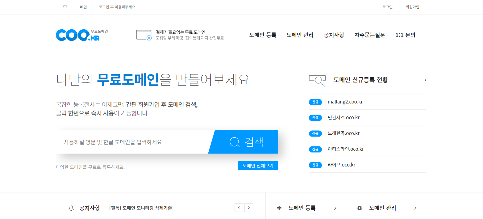 무료로 도메인 등록이 가능한 사이트입니다. 먼저 회원가입을 한 후 원하시는 도메인명을 검색합니다.
