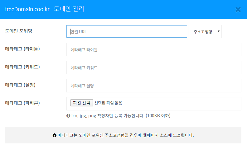 도메인이 생성되면 위와 같은 페이지가 나옵니다. 위의 사항들을 작성한 뒤 저장하기 버튼을 누르면 호스팅이 시작됩니다.