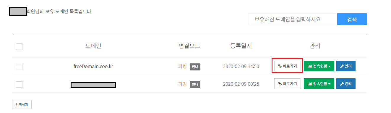 여러개의 도메인 명이 나옵니다. 검색한 도메인명에 뒤에 여러가지 문자열들이 조합 된 형태들이 있습니다. 원하시는 도메인을 선택한 뒤 등로하기 버튼을 누릅니다.