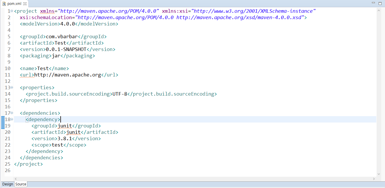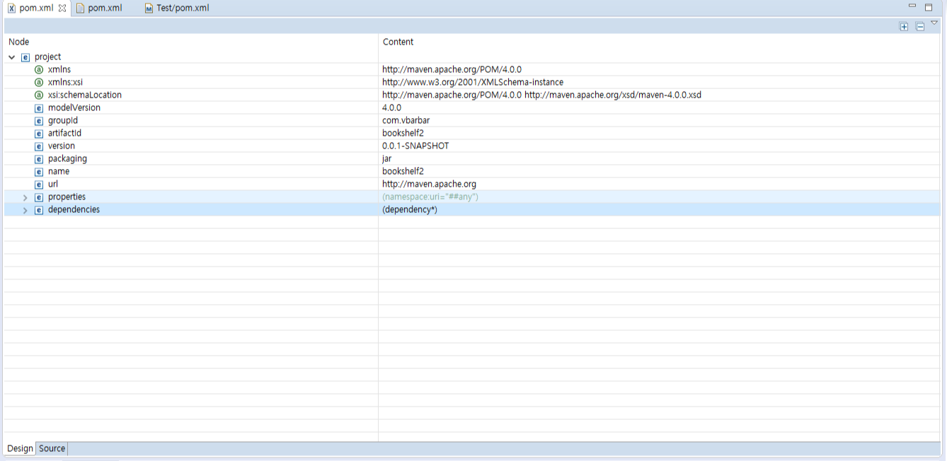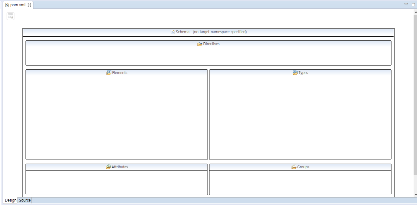 위의 과정을 마친 뒤 파일을 열면 이러한 창이 나온다. 당황하지 말고 편집창의 왼쪽 아래를 보면 탭으로 Design과 Source로 구분되어 있다. 이 창은 Design탭이고 Source를 클릭하면 아래와 같이 일반적인 XML편집창이 나온다.