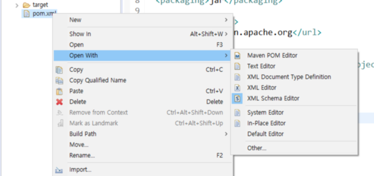 처음에 이클립스를 설치했을 때, 버전에 따라 기본 XML편집창이 다를 수 있습니다. 일시적으로 XML 편집창을 변경하는 방법과 기본 XML 편집창으로 설정하는 두가지에 대해 모두 알아보겠습니다.