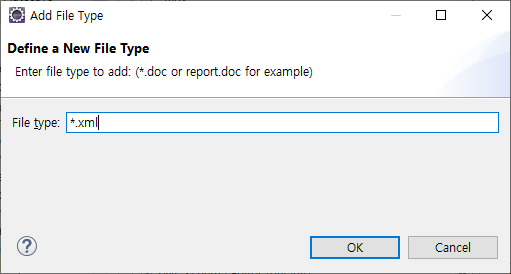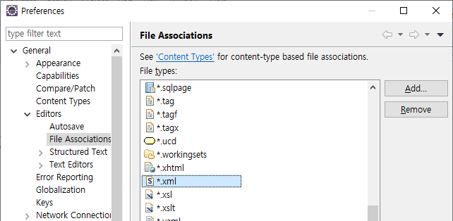 파일확장자 리스트의 에서 *.xml파일 찾는다.없다면 [Add 버튼]-[*.xml 입력]-[OK 버튼]으로 추가한 뒤 [*.xml 클릭]후 아래 단계 진행